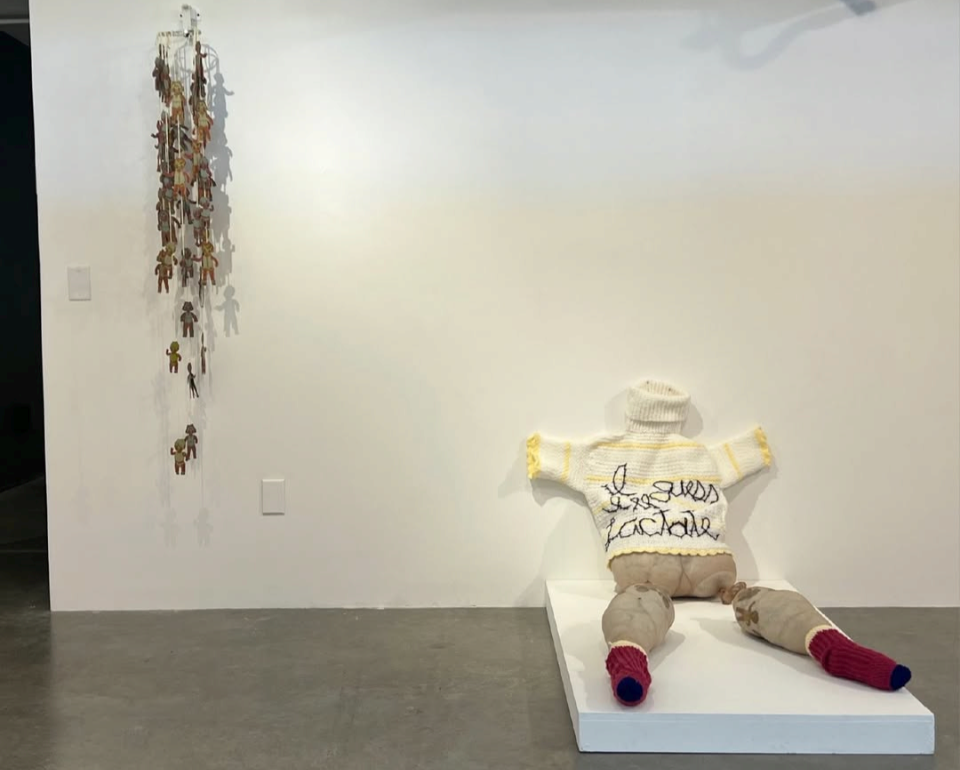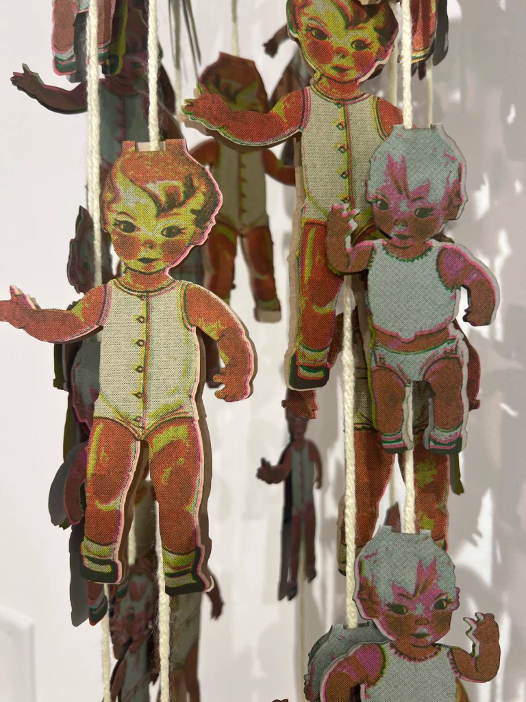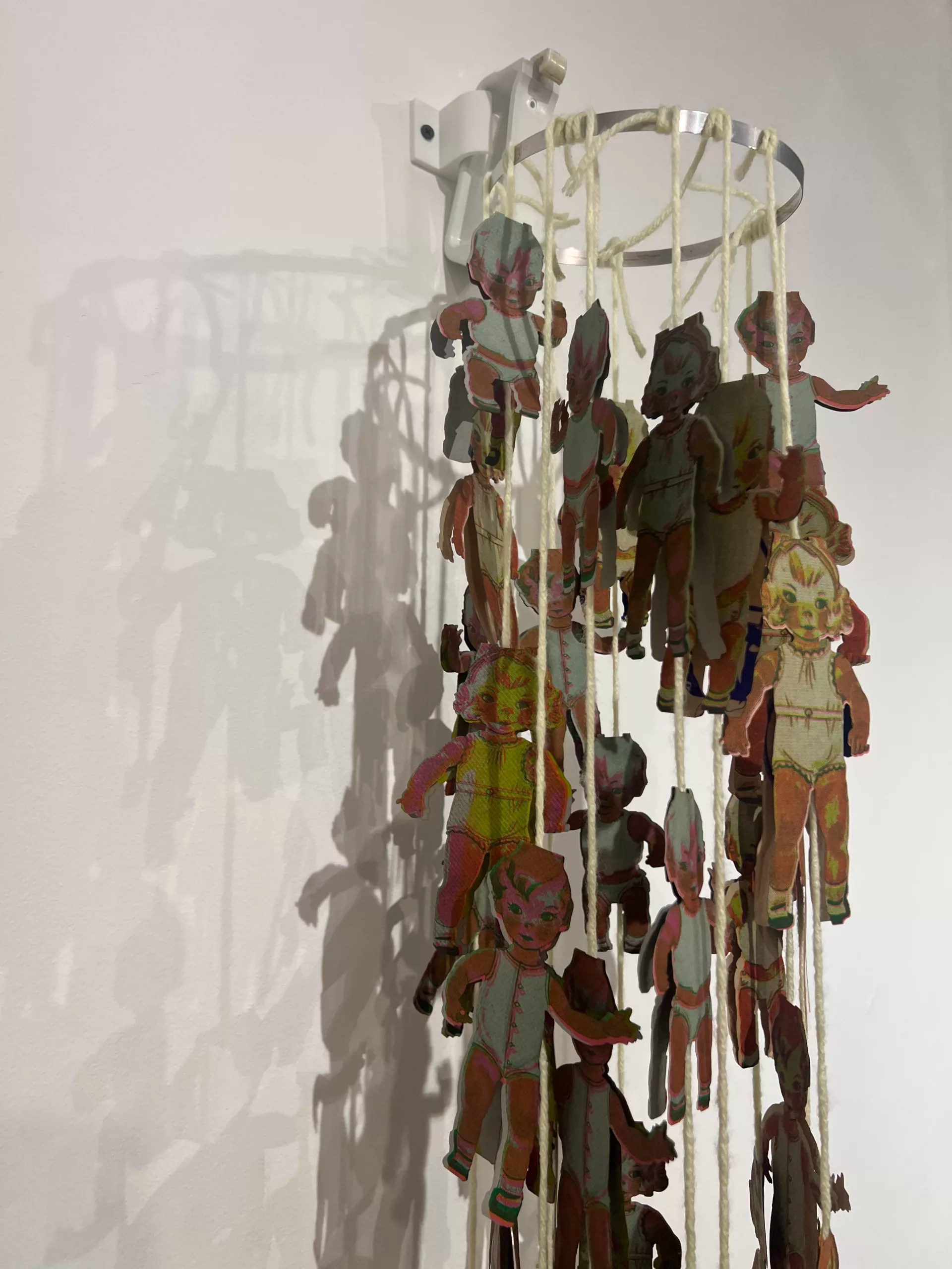 Media: KRUPS Carafe Remnants (glass destroyed in accident) plastic & metal, acrylic yarn, risograph